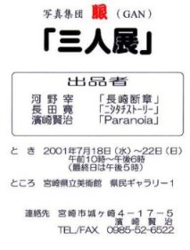 宮崎大学助教授 石川千佳子先生に、講評を頂きました。 「最後に、同ギャラリーでの『写真集団「眼」(GAN)写真展』について。 帯状に淡々と続く三人の写真の中で、河野宰による『長崎断章』シリーズの 対象をきりとる角度に、独自のセンスが見えた。」 (8月1日付け宮崎日々新聞文化面「アートこらむ 7月の県内美術」より) |